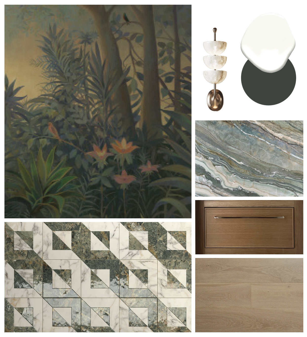 Metalwork mixes polished nickel and brass, creating subtle visual interplay between cool and warm finishes. Modernized foliage wallpapers nod to traditional botanical prints while feeling distinctly current—a perfect metaphor for the home itself.