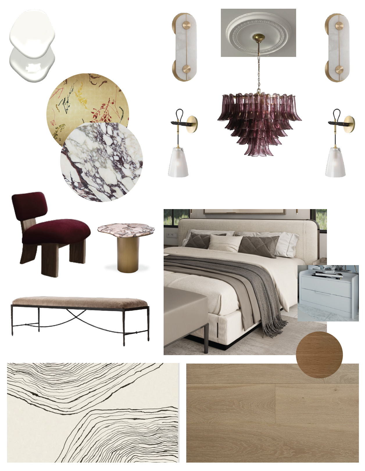 Historic architectural details meet modern furnishings and statement lighting that bring unexpected energy to each room. The material palette creates deliberate tension: crisp white walls and soft gray cabinetry form a gallery-like backdrop for carefully chosen gem tones adding depth and personality. White oak flooring and custom millwork introduce organic warmth, grounding the contemporary elements.